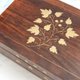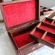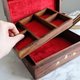 由木匠親手製作,非常漂亮的紅木和黃銅鑲嵌的首飾盒,帶有蔓藤花紋圖案。裡面全紅色絨面,分成兩層,上層有分格而下層是一整個大格,造工非常精緻。