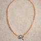 以愛為靈感,粉色珍珠象徵浪漫與柔情,銀色愛心扣增添精緻質感,整體風格簡約優雅,寓意永恆愛意。