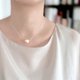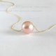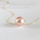 モデルの首回りは約33cmで、ペールオレンジのパールを着用。