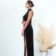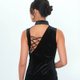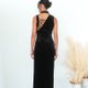 這款直身的Maleficent旗袍由光滑的絲絨製成,設有經典的中式企領、高開衩和水晶鈕扣點綴,背部則有綁帶細節,營造出華麗時尚的風格。搭配高跟鞋和鑽石耳環,使整體造型更加完美。