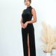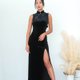 - 直身高衩絲絨旗袍,設有經典的中式企領、水晶鈕扣點綴和背部綁帶細節,營造出華麗時尚的風格。十分適合公司周年晚宴和雞尾酒派對。