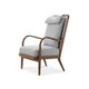 現代風格休閒椅, 以高雅灰布料搭配頂級北美胡桃木,椅背為羽絨填充柔軟蓬鬆舒適,扶手圓弧曲線, 線條俐落優雅, 展現輕盈高貴品味。