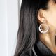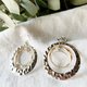 真鍮をハンマーで叩かれたような質感のメタルパーツに、サイズ違いのラウンドを重ね、シンプルながら存在感のあるイヤリング/ピアスに仕立てました。