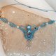 The "Celestial Dreams" macrame necklace features a stunning combination of blue macrame, labradorite, and rainbow moonstone, all beautifully crafted with a dreamcatcher pendant and silver bead embellishments.