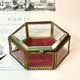 - 絕稀的法國古董珠寶盒,難得一見的六角形玻璃盒,以極簡方式捨棄了傳統底座與腳座的繁複設計,讓框架直接與桌面優雅地接觸,展現出沉穩而純粹的幾何之美,既典雅亦奢華!手工打造的黃銅/鍍金框架,搭配細膩雅緻的蕾絲狀金屬飾邊,深紅絨面內襯保持完美!