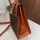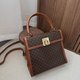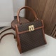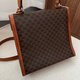 超罕有的 Celine Kelly 風格手提包,經典 老花 Macadam monogram 配上溫潤棕色皮革滾邊,還有亮眼的 金色Kelly釦,完全展現了 Celine 般的高雅氣質和復古的韻味。