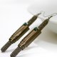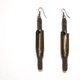 Modern style crochet tube stick earrings made with smoky brown metallic thread and aluminum sheet in the same color, adorned with little emerald green crystals.