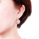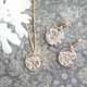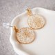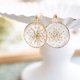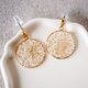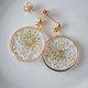 白いレースフラワーを押し花にして、カット模様の入った丸いパーツに樹脂でとじ込めたシンプルなアクセサリー。