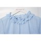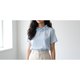 A short-sleeved shirt featuring a ruffled neckline and a single button closure at the back. The hem is slightly slit on both the left and right sides, ensuring a comfortable fit around the hips.