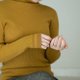 袖口のベージュ部分には茶色い綿を使っており、ナチュラルカラーのカフボーダーとなっています。植物染めを施したセーターは、そのボーダー部分がそれぞれの色に寄っています。