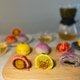 - 外皮原料 無水奶油/麵粉/沙拉油/糖 紅色 口味:烏豆沙蛋黃酥 外表紅色為草莓醬製作 紫色 口味:芋泥黑糖麻糬 外表為紫薯粉製作 黃色 口味:咖哩肉鬆 外表為薑黃粉製作