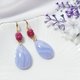 冰藍紋瑪瑙寶石紋理清晰、線條流暢優美、水光勻淨、冰透水潤、無黑點礦缺,與艷粉玫瑰石相襯,色澤炫麗雍容,是為一時尚、靜謐、優雅美物,流露恬靜的氣息。