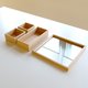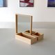 - コンパクトな箱が3つ配置されたようなデザインの化粧箱です。 蓋の裏が鏡になっていて、3つの箱の隙間に設置すると卓上鏡のように使えます。