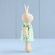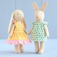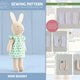 This pattern includes step-by-step photo instructions and full-size pattern pieces to make a mini bunny doll with stand-up ears. The bunny is wearing a dress with an elastic neckline. The dress is fully lined, closes in the back with a hook and loop tape, and you will find it easy to make in spite of its small size, using my technique. The bunny easily fits in a pocket and it's perfect to take along for a walk or for a trip. The doll does not stand without support.