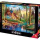 湖畔木屋在夏日夕陽餘暉下顯得格外溫暖,石牆與木質結構房屋散發出質樸之美。門前停著藍色老爺車,一旁躺椅及旁邊的營火,散發懷舊氛圍。前方小船停泊於平靜湖面,湖邊林立的樹木與草地,生機盎然。三、五隻梅花鹿、水中番鴨及天空成群的野雁,在綠草如茵的草地上與沁涼溪水倒影中,充滿夏日的活力與和諧,將大自然的景致妝點得美不勝收∘