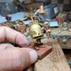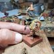 他拿著鋸弓,專注地切割金屬,桌上有木樁、三把小榔頭與一盞燈,像極了創作者每日的工作場景。