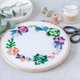 The sample was made on 18 count white aida and framed in a 8'' hoop.