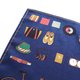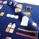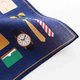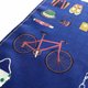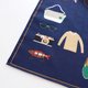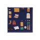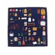右側には、ネクタイや腕時計、パソコンなどのお仕事アイテム。左側には、自転車やカメラ、ギターなど趣味にまつわるアイテムが描かれています。 生地には光の加減で格子柄が見える、ブランドオリジナルのジャカード生地を使用しています。
