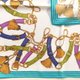 復古方巾,採用優質棉質製成,印有精美圖案,並配有金色鏈條和彩色皮革流蘇。