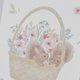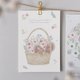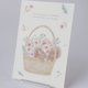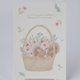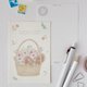 色とりどりの草花を詰め込んだ花カゴのなかで、2匹のリスが仲良くおしゃべり。小さな動物と草花の、ほっと心和む瞬間を描いたイラストポストカードです。