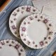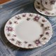 土瓷盤來自英國名瓷Royal Albert於1960年代至1970年代之間製造的Sweet Violets(甜紫羅蘭)系列,紫羅蘭的設計帶有濃濃的英式鄉村風,材質由骨瓷材質,骨瓷材質比一般瓷器更易清潔,保溫效果更好,胚體也更輕薄透光,金邊則是22K金手工上色而成。