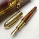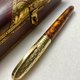 老山羊葛瑪蘭系列筆款,獨家設計,大器優美筆型。筆蓋是黃銅實心車製,再蜂巢紋飾雕刻未電鍍,黃銅特殊彈性筆夾,天然漆手工多層次塗層,純金金箔照明。行家品味獨特塗層,鋼筆富含多層次感 - 流金歲月,每支金箔所形成的紋路都不一樣,華麗美觀,天然漆筆身有特殊的溫度,溫潤如玉令人愛不釋手。