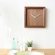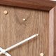 和榫接部分相同,鐘面時間刻度所使用的木種也是楓木。和深褐色的黑胡桃木形成對比的淺白色楓木,材質是彷彿無垢材一般的高水準刨切單板。與鐘面相互陪襯,讓掛鐘整體看起來純粹又簡潔。此外,因為使用了單板,不僅讓掛鐘價格平易近人許多,掛鐘的重量也較輕便。指針則統一使用顯眼的白色。選用市面上普遍所使用的機芯,因此只需要一個三號電池就可以了。不但時尚好看且使用方便,機能性相當高的一款掛鐘。