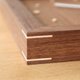 掛鐘四個角落都有俐落的榫接設計,像這樣的卡榫能為單調的木製品增添設計感。這種技法稱為「榫接」。將要接合的部分,刻出能夠彼此契合的溝槽,讓兩個零件合而為一成為L型部件。讓楓木卡榫沒有縫隙的完全嵌入,需要相當高超的技巧。而使用榫接製作而成的作品會比使用黏著劑來的耐用許多。