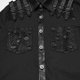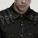 - 狂野的龐克街頭男襯衫。採用微彈斜紋梭織料,裂紋皮,網布製作。肩部對稱並排日字扣袢裝飾凸顯力量感。不規則破洞網拼接,讓款式更有看點。門襟採用八角形骷髏頭扣。