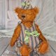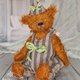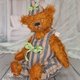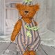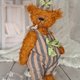 I made a jumpsuit and a hat for the bear. The jumpsuit and the hat have a lining and are decorated with bows. The jumpsuit has buttons, and the hat has an elastic band.