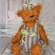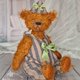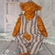 This handmade teddy bear is crafted from German mohair, filled with cedar shavings and wood wool, and weighted with mineral granules. It is made using traditional teddy bear techniques with discs and joints. The bear features brown glass eyes, an embroidered nose, and is toned with dry pastel.