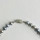 此款為日本製玻璃珍珠,採用玻璃原珠,經過本公司原創珍珠塗料多層次塗佈而成。珍珠之間皆以手工仔細打結,採用「全結」工法完成。珍珠顏色為質感細緻、光澤柔和的冷色系珍珠。隨機混搭不同深淺的粉彩色系灰色珍珠。珍珠尺寸為經典的約 8mm 珠,長度為標準的公主款全長約 42cm。項鍊扣採用鑲有一顆水鑽的插入式設計。