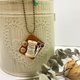 吊墜以皮標為基底,縮小版的裁縫用品組合設計,合金和木質異材質搭配,立體層次感滿分,做舊的古銅色鏈條上彩色的木質珠珠裝飾點綴,整體做工細緻、小巧可愛。