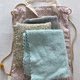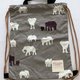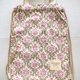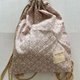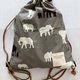 プリント生地をふんだんに使って作りました。素敵に仕上がりました。やや小ぶりです。ショップタグに余白を空けたのでお名前を記入できます。裏地付きです。ゾウ柄はシーチング地で軽い仕上がりです。ダマスク柄は、オックス地でしっかりとした作りです。フック掛けにも便利な持ち手を付けました。お着換え袋に、ジム用バッグに、お出かけにと、幅広い用途でお使いいただけそうです。ひもは長めにお付けしていますので、お好みに合わせて調節してお使いください。