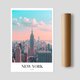 《紐約晨曦天際線 New York Skyline Dawn》以溫潤粉橘與清透藍調,描繪世界最具象徵性的城市景觀。帝國大廈矗立於畫面中央,向天空延伸的線條象徵無限的力量與夢想;遠方海灣與日出雲霞交織,為這座鋼鐵城市覆上一層柔光。