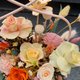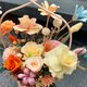 花材組合豐富,包括不同顏色和大小的永生玫瑰(黃色、橘色、淺粉色)、索拉花、滿天星、繡球花以及各種乾燥配花和綠色葉材。
