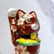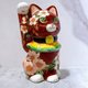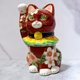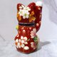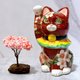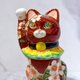 日本清水燒招財貓以赤紅色為底,採用色繪技法,繪製了櫻花圖案,展現出華麗而溫暖的風格。