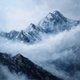 《雲隱山嶺》以冷色系油畫筆觸描繪山巒被雲瀑包裹的瞬間,層層堆疊的厚塗質感讓光影在霧氣間若隱若現,呈現出近似實景卻更具詩性的視覺深度。作品主視覺的垂直構圖,能自然延伸空間的高度感,使室內更顯沉穩與開闊。