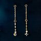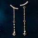 這些墜飾的靈感源自月光下星辰的軌跡。月亮和星星的圖案巧妙地運用,表達出獨特的世界觀。藍色藍寶石(九月誕生石)與莫桑石的藍白色對比,營造出精緻的氛圍。它配有兩個跳環,可將鏈條穿過單側耳朵的兩個耳孔,作為穿孔耳環佩戴,打造出兩用單品。