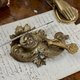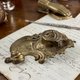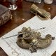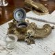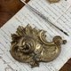 華麗的法國黃銅墨水台,屬於 19 世紀法國的洛可可復興風格,裝飾元素以貝殼、渦旋、花卉和葉片為主,呈現優雅而動感的設計,中央小蓋子內玻璃瓶存放墨水,墨水槽後可托置沾水筆,托盤可用來放置封蠟章。黃銅經過歲月洗禮,表面呈現溫潤古銅色澤,增添歷史感。
