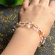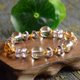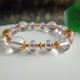 8×5公釐玻利維亞淡紫水晶算盤珠同11公釐精磨白水晶圓珠串聯而成的手串,以上水晶晶體幾達到高透光近淨體等級。在光照下呈現均勻明亮的玻璃光澤,特別融入兩顆10公釐黃水晶圓珠作為色彩點綴,晶體內部僅含極少冰裂紋與絮狀包裹體,保持天然水晶特有的生長印記。金屬配件全部採用純銀鍍金工藝,包含精緻的花托、隔片,小圓珠與算盤珠造型。金白配色與水晶透質感形成巧妙呼應,珠體經過多道拋光工序呈現飽滿弧面。不同形態珠子的組合增強視覺層次感,當光線穿透晶體時會產生柔和的折射光斑。轉動間金屬配件與水晶交織出靈動光暈如初雪凝於腕間,又似朝露綴滿花枝,這串手鏈將天地靈氣凝練成方寸之間的詩意。