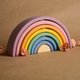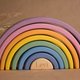 - Wooden rainbow stacking toy in soft pastel colors according to the Montessori method is a set of wooden arcs that can be assembled into a rainbow pyramid without an axis.