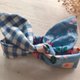 綁起來的蝴蝶結大小是因應頭圍而有變化,頭圍小蝴蝶結綁起來會較大、反之頭圍長大後蝴蝶結就會比較小喔:)