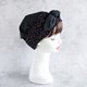 ヘアターバンの形状で、頭部をしっかりとカバーし、ずれにくいデザインです。