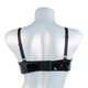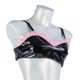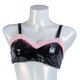 Black patent bra top is made of faux leather and decorated with pink frills.