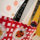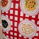 背景の赤いチェック、赤いお皿、パスタの部分がジャカードで、