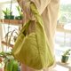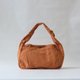 スナップボタンで閉じられる口と、側面の大きなポケットで機能的なうえに、カジュアル過ぎない上品なショルダーバッグ。バッグのマチから続くショルダー紐を持つと、ゆるい三角形に見える優しい印象のカバンです。