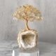 「聚寶盆-永生水晶樹」是以黃水晶與晶洞結合注金工藝線編製而成。底部使用纏繞的方式包裹著晶洞,展現出根系生長的姿態,順著枝幹向上攀升的過程,逐漸展現出花木的生長方式,結上一顆顆的黃水晶,猶如枝葉綻放,絢麗而生動。