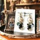 この漆黒のビジューは、上品な光沢を持ち、角度によって微妙な光の変化を楽しむことができます。ビジューを包み込む繊細なゴールドの装飾は、まるで星々が花々の間に舞い降りたかのような優雅さを表現しており、シンプルでありながらも目を引くディテールが特徴です。また、グリーンとゴールドのクリスタルガラスがアクセントとして施されており、耳飾り全体に立体感と動きが加わります。