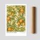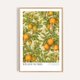 本幅作品靈感取自威廉・莫里斯(William Morris)對自然植物與田園生活的詩意描繪。畫面中,枝葉繁盛,橘子與黃果點綴其中,圓潤果實於柔和奶油底色上躍然浮現,營造出明亮愉悅的氛圍,如初夏陽光灑落於果園之中。